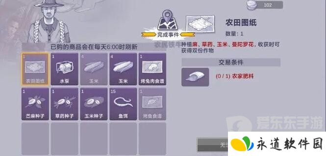鱼饵烤鱼目前没用,烤兔肉食谱必须买,农田看需求,制作诱饵需要米。