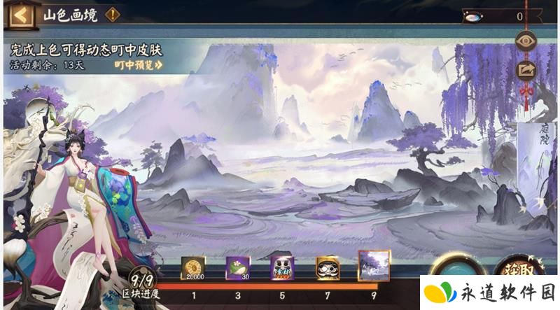 当阴阳师大人完成区块上色达到指定进度时,可依次解锁获得四星奉为达摩、御行达摩碎片等珍贵奖励。而当所有区块上色完成后,大人还可以免费领取活动限定的动态町中皮肤“山色画境”,感受远山缥缈、清溪幽邃的仙境之美,让妙手点染的素纸展现出如梦如幻的山水画卷。