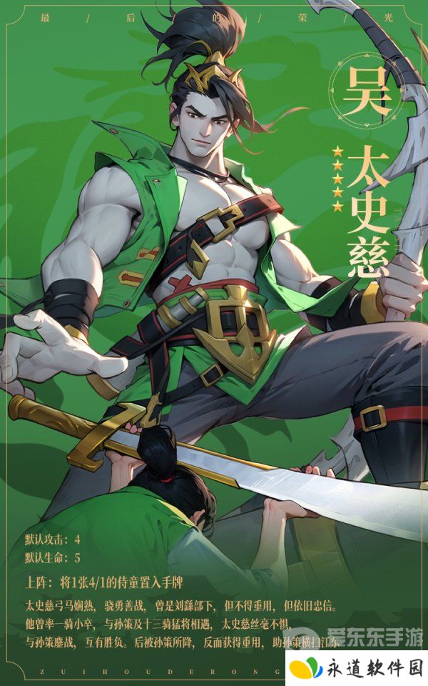 最后的荣光太史慈角色图鉴怎么样?很多玩家都想知道太史慈这个角色的背景和属性怎么样,下面小编就给大家带来最后的荣光太史慈角色图鉴一览,有兴趣的朋友可以了解一下。