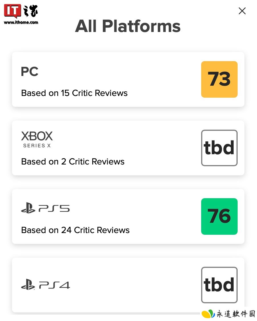 目前这款游戏媒体评分已解禁,游戏在 Metacritic 平台 PC 版均分 73(15 家媒体)、PS5 版均分 76(24 家媒体)。