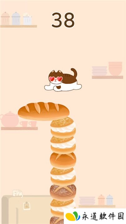 3、玩家需要操控猫咪跳跃到不断移动过来的面包上,叠加的面包越高,得分也就越高