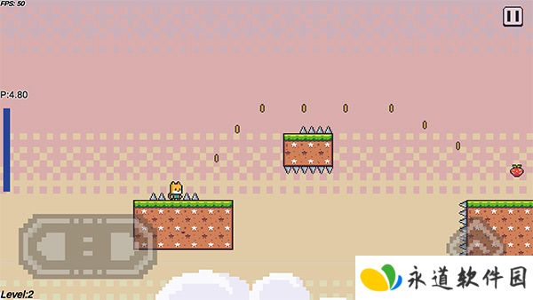 2、长按跳跃键可以喷气,让小狐狸飞起来,玩家可以控制好方向收集上方的金币,收集到草莓就可以通过关卡。