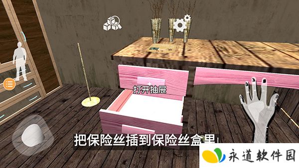3. 左侧圆形按钮控制角色移动,而右侧手掌按钮用于打开抽屉、门或使用物品。在不同的房间内,我们需要仔细查找所需的物品。
