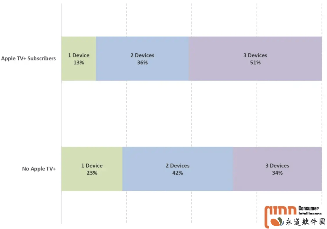 然而,最近的一项研究报告揭示了苹果运营Apple TV+背后的逻辑。消费者情报研究伙伴公司(CIRP)的调查结果显示,Apple TV+会员似乎更倾向于购买更多的苹果产品。具体而言,超过一半的Apple TV+会员拥有至少三款苹果设备,这一比例远高于非会员。