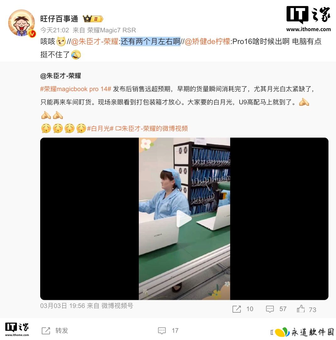 感谢本站网友 lemonrain 的线索投递! 本站 3 月 4 日消息,荣耀PC产品线总经理@朱臣才-荣耀在微博回应网友称今年MagicBook Pro