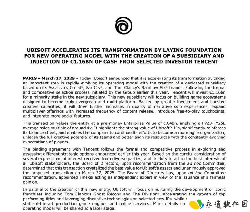 北京时间2025年3月28日凌晨,育碧(Ubisoft)宣布将旗下《刺客信条》《孤岛惊魂》和《彩虹六号》等热门游戏IP及相关开发团队拆分,成立一家新的游戏子公司。腾讯将以11.6亿欧元(约合90.84亿元人民币)注资,获取该子公司25%的股权。此次交易预计将在2025年底前完成。