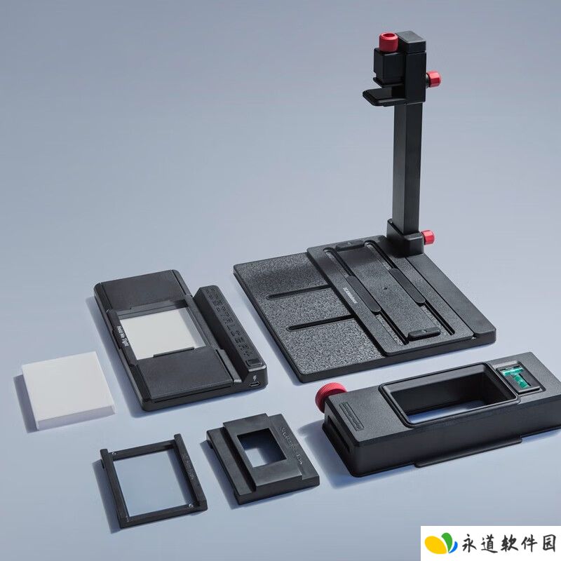 该扫描匣附带一个可拆卸的水平仪,用于检查相机角度是否保持平直。本站从商品页获悉,DigitalLIZA + 版本只可用相机扫描胶片,DigitalLIZA Max 版本附带手机立柱和扫描底板,可用手机和相机扫描胶片。
